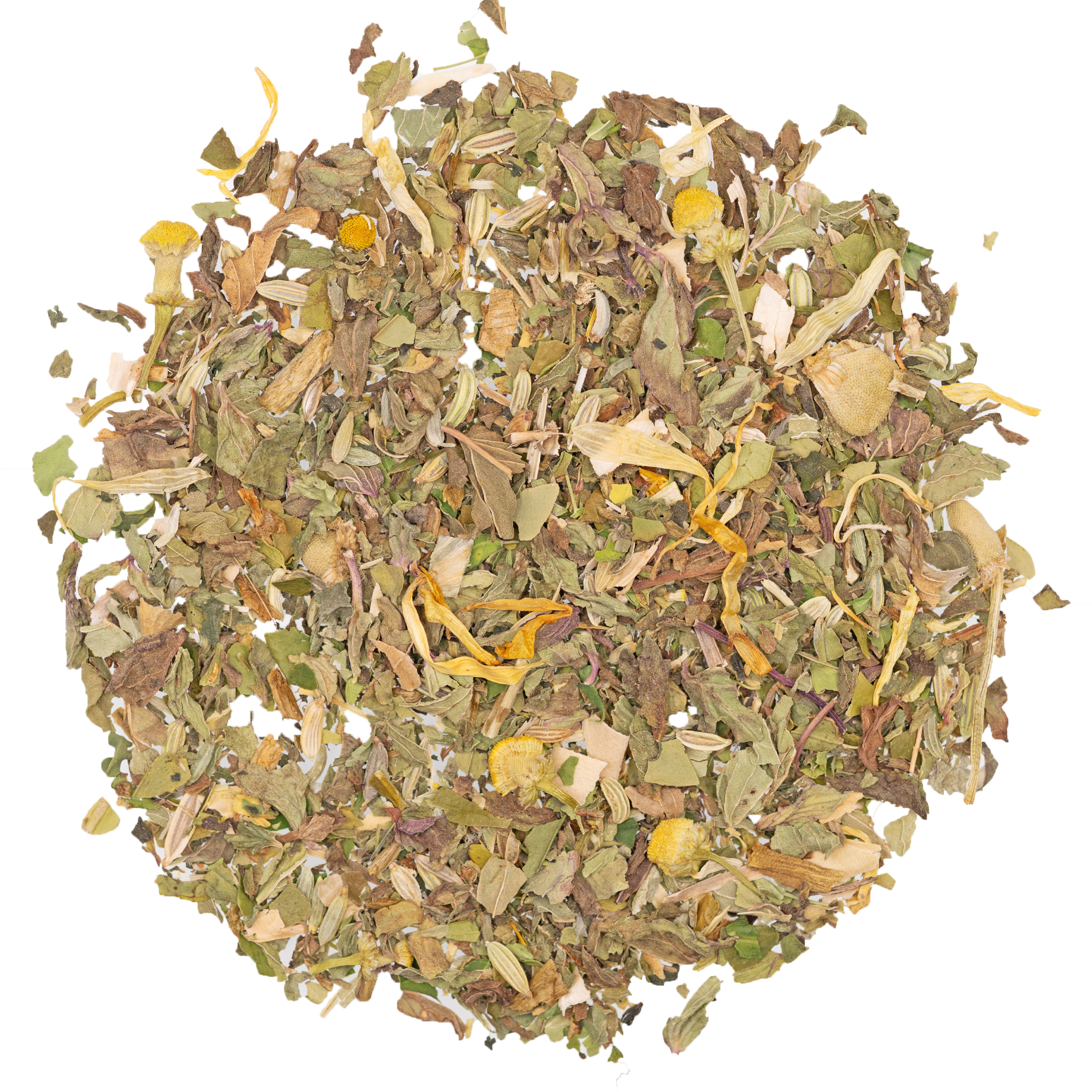 Himbeerblätter, Brombeerblätter, Anis, Fenchel, Cystuskraut, Lavendelblüten, Kaminblüten, Sanddornbeeren