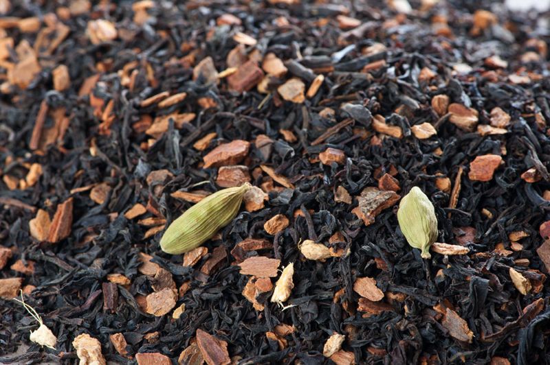 Schwarzer Tee, Zimtstücke, Ingwer, Kardamom, Gewürznelken, schwarzer Pfeffer