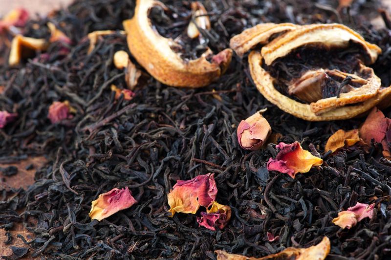 Schwarzer Tee, Limonenstücke, Bosenknospen, Rosenblütenblätter
