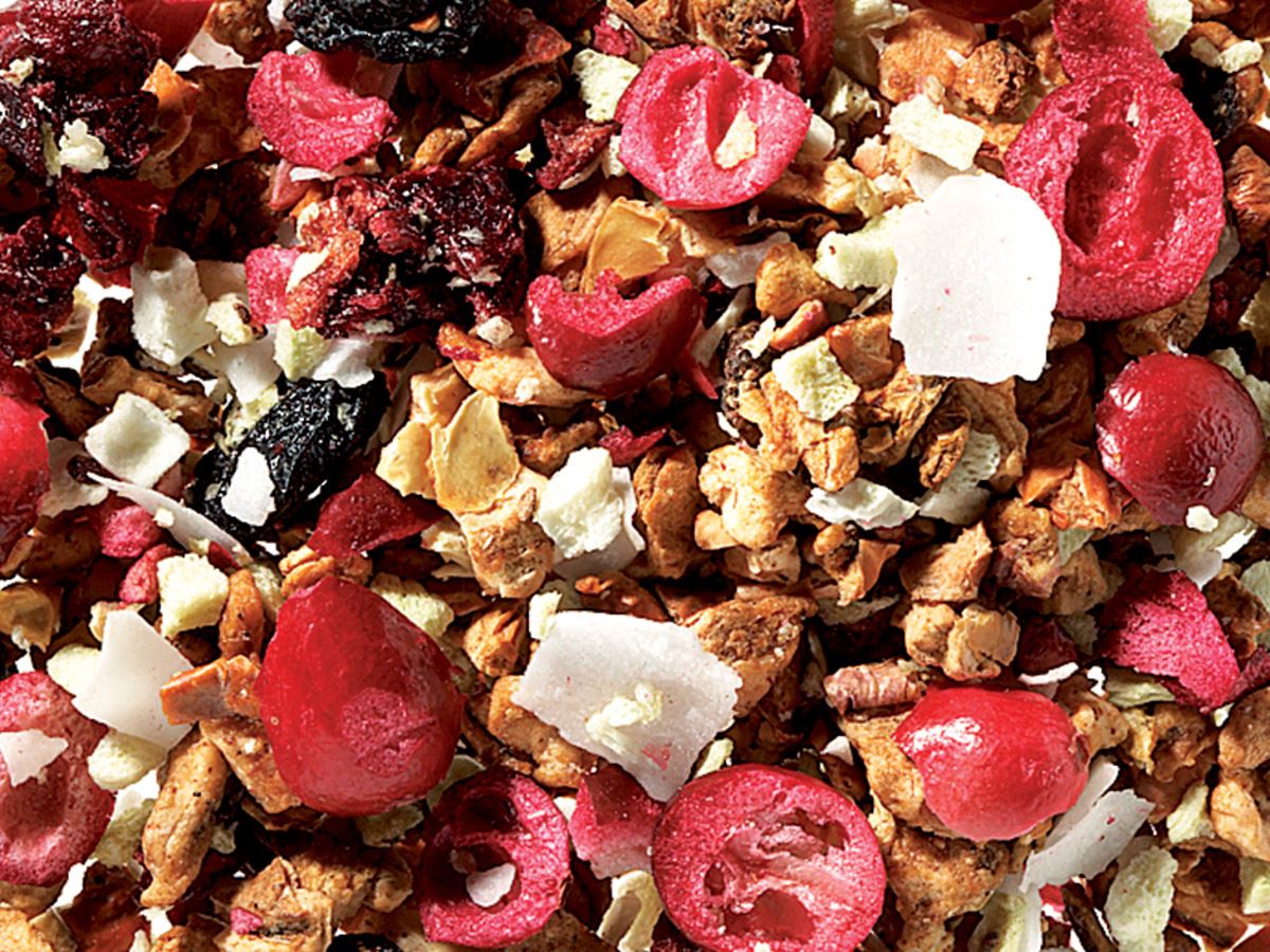 Apfelstücke, ganze Sauerkirschen, Kokoschips, gefr.-getr. Kiwistücke, gefr.-getr. Sauerkirschstücke, gefr.-getr. Cranberryscheiben, Aroma.