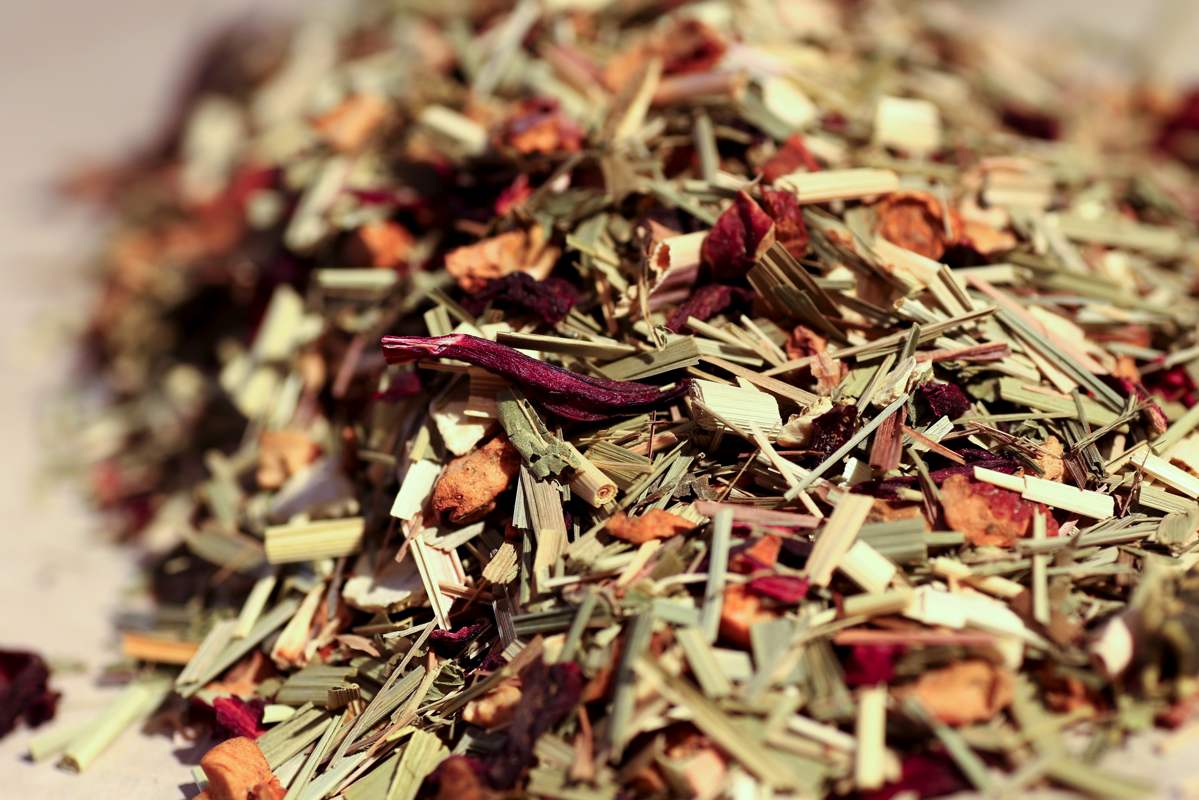 Lemongras, Apfelstücke, Hibiskus, Orangenschalen, Zitronenverbenenblätter, natürliches Aroma