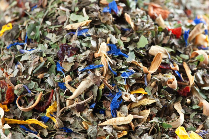 Hagebuttenschalen, Melisse, Brombeerblätter, Zitronengras, Hibiskusblüten, Silberlindenblüten, Kamillenblüten, Zitronengranulat, gezuckerte Aprikosen, Pfefferminze, rote Johannisbeeren, Erdbeer – Brombeer – Himbeerstücke