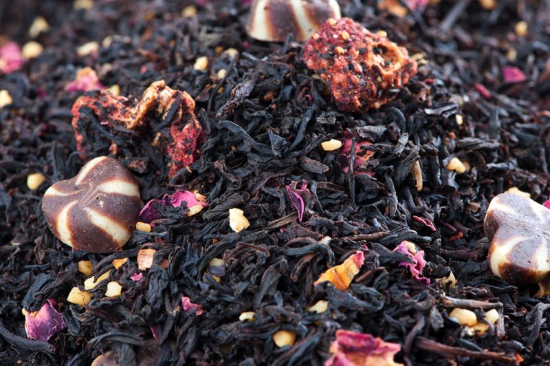 Schwarzer Tee, Zartbitterschokolade, weise Schokolade, Kakaopulver, Mandelstücke, Aroma, Rosenblütenblätter, Erdbeerscheiben
