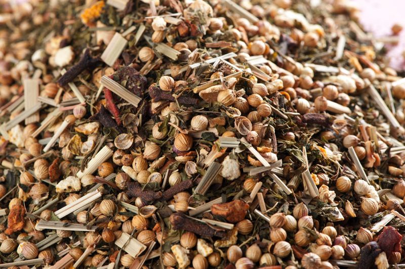 Koriander, Nanaminze, Brennesselblätter, Orangenschalen, Lemongras, Apfelstücke, Zimtrinde, Ingwerstücke, natürliches Aroma, Nelken, Karadmom, Zitrusöl